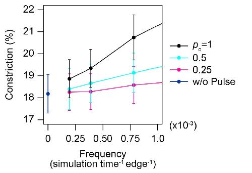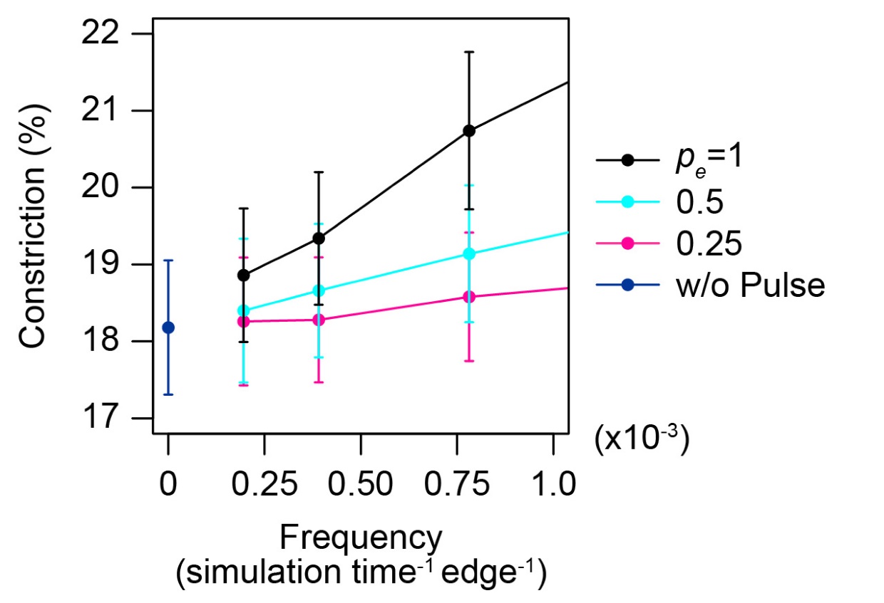 Figure S6. Relationship between pulse number and constriction rate in sparse condition. A magnified plot of mean constriction at the end of the simulations in Fig. 7D. The proportion of cell edges undergoing contraction per cell was set at probability (pe) 1 (black), 0.5 (cyan), and 0.25 (red). Condition without pulse is also shown (blue). Error bars depict s.d; n = 5 different initial conditions. Details of the models and the simulation processes are described in Supplementary Materials and Methods. |