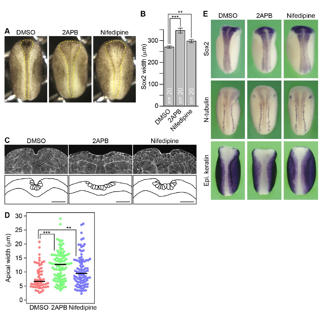 Fig. 1. Intracellular Ca2+ is required for Xenopus NTC. (A) Dorsal views of embryos at stage 16 treated with DMSO, 25 μM 2APB and 200 μM nifedipine. Dashed lines indicate the outlines of the NP. (B) The mean width of the NP in embryos, as measured by visualizing the expression of the pan-neural marker gene Sox2. Error bars depict s.e.m. The number of embryos examined is shown on each bar. **P<0.01 and ***P<0.001 compared with the DMSO-treated control; two-sided Welchâs t-test. (C) Transverse sections of stage-16 embryos stained with phalloidin (top) and outlines of neural tissues and cells (bottom). Scale bars: 100 μm. (D) Apical width of stage- 16 embryos. Black line indicates the median value. **P<0.01 and ***P<0.001, two-sided MannâWhitney U-test; n=54 cells, nine embryos (DMSO); 97 cells, 12 embryos (2APB); 88 cells, 12 embryos (nifedipine). (E) In situ hybridization analysis of inhibitor-treated embryos. Dorsal views showing the expression of Sox2, a pan-neural marker (top), N-tubulin (tubb2b), which marks differentiated neurons (middle), and Epidermal keratin (Epi. keratin), an epidermal marker (bottom). Anterior is to the top. The expression patterns were similar in inhibitor-treated embryos and DMSOtreated controls, but the expression domains were wider in the inhibitor-treated embryos because of delayed NTC. |