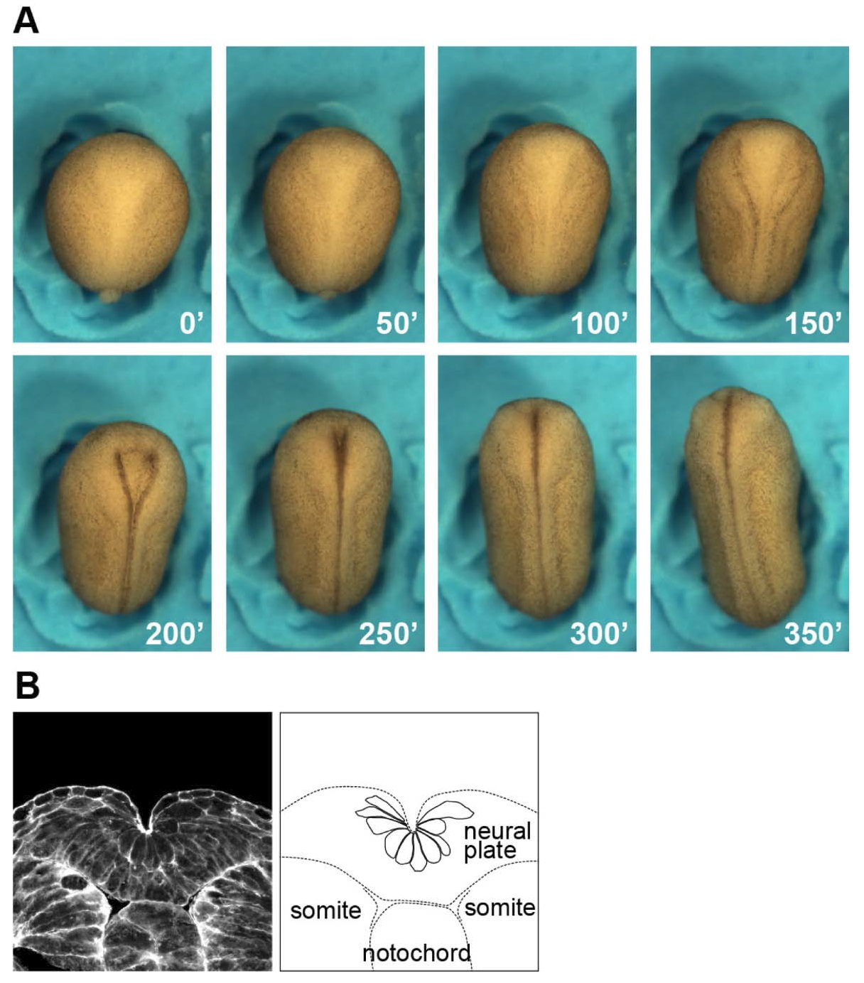 Figure S1. Neural tube closure in Xenopus laevis. (A) Time-lapse imaging data of the neural tube closure of a Xenopus laevis embryo, dorsal views. The elapsed time (minutes) is shown at the bottom right of each panel. (B) A transverse section through the neural plate of a stage-16 embryo, stained with phalloidin. Right: illustration of NP cells in the surface layer undergoing apical constriction. Development 144: doi:10.1242/dev.141952: Supplementary information Development ⢠Supplementary information |
