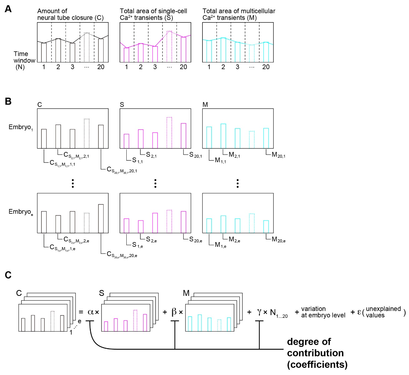 Figure S7. Schematic workflow for statistical validation of prediction from simulation using observations in vivo. (A) Temporal profiles of closing movement, the total area of single-cell Ca2+ transients, and multicellular Ca2+ transients during last 200 minutes before the completion of NTC. (B) Generation of data set for statistical analysis by dividing temporal profiles into twenty time windows. (C) Fitting mixed linear model to the data set to estimate contributions. See Supplementary Materials and Methods for the detail. |