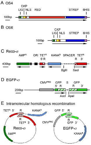 plasmids. (A,B) Constructs encoding the shuttle proteins OS4 (A) and OS6 (B). LIG, vitellogenin ligand; CKP, casein kinase phosphorylation site; NLS, SV40 nuclear localization signal; RED, red fluorescent protein (in OS4 only); STREP, streptavidin core; 6HIS, His tag. The different segments were either cut from corresponding plasmids, synthetic oligonucleotides, or synthesized by PCR, adding appropriate linkers. For sequences see Fig. S1 (OS4) and Fig. S2 (OS6). (C) Donor plasmid Reco-σ with unique 5′ segment (5′), internal repeat (R) and unique 3′ segment (3′). AmpR and KanaR, genes coding for ampicillin and kanamycin resistance respectively. (D) Plasmid pEGFP-σ contains two 320 bp repeats of the coding segment of pEGFP-C1 between the BclI and GsuI sites, separated by a linker (S) with AccI and ApaI restriction sites. 5′, R, 3′, as in C. (E) Intramolecular homologous recombination within linearized Reco-σ and EGFP-σ DNAs. Crossing-over (×) takes place between the homologous repeats (R).