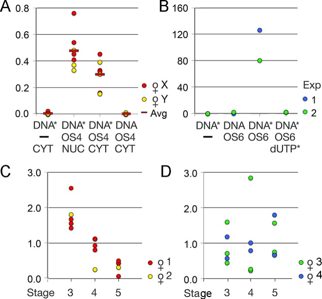 Fig. 3. Transport of biotinylated DNA. (A) Transport from cytoplasm to nucleus in oocytes collected from two females (X,Y). Linearized Reco-σ, biotinylated (DNA*) or untreated (DNA), was injected without (–) or with OS4 shuttle protein into the cytoplasm (CYT) or nucleus (NUC). The numbers of TetR colonies obtained with DNA recovered from these oocytes were normalized (ratio) to the number of colonies obtained in the same series by direct nuclear injection of linearized Reco-σ. Red bars (Avg) depict mean values in each experimental point. (B) Transport from blood to oocyte nucleus in situ. Two independent competition experiments in which biotinylated Reco-σ alone (DNA*), non-biotinylated Reco-σ (DNA), or biotinylated Reco-σ mixed with OS6 protein, or a mixture of OS6 protein pre-incubated with excess 14biotindUTP was injected, each mix into two females. Values indicated are TetR colonies per plate. (C,D) Biotinylated Reco-σ (DNA*) linked to OS6 protein was injected into four females. After two days, DNA was extracted from batches of stage 3, 4 or 5 oocytes and used to transform bacteria that were first grown on ampicillin and then replica-plated on tetracycline plates. The uptake of donor DNA was highest in stage 3 oocytes of females 1 and 2 (C), whereas in females 3 and 4 (D), the oocytes of all stages took up variable amounts of DNA with no clear preference for a given stage. The values are given as the ratio of TetR colonies per batch over the average number of TetR colonies in all batches of the same female.