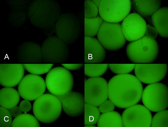 Fig. 4. Expression of transported EGFP-σ in ovary. Fluorescent micrographs. (A) Control ovary recovered from a female injected two weeks earlier with biotinylated EGFP-σ without shuttle protein into the bloodstream. (B) Ovary and (C,D) isolated oocytes from three different females injected with biotinylated EGFP-σ bound to OS6 protein. Exposition and image treatment of the four shots were equal.