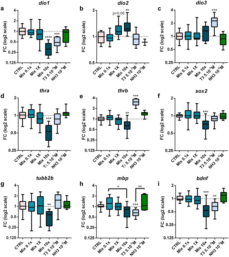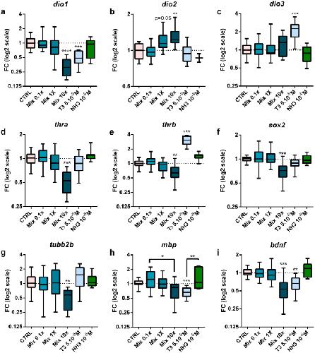 Figure 3. Mixture exposure modifies thyroid hormone and neuronal development related gene expression in brain.Wild type NF45 X. laevis tadpoles were exposed to mixture for 72âh in the absence of T3. For each concentration tested between 7 to 12 pools of three brains were used from at least four independent experiments. Total brain mRNA transcripts levels were quantified using RT-qPCR: (a), dio1 (b), dio2 (c), dio3 (d), thra (e), thrb (f), sox2 (g), tubb2b (h), mbp (i), bdnf. Relative fold changes were calculated using geometric mean of ef1a and odc as normalizers. Results are presented as fold changes using a log2 scale and DMSO-treated animals (CTRL) values for the 1.0 reference. Statistics were done on dCts and used Kruskal-Wallis tests (Box plots median and quartiles), *pâ<â0.05, **pâ<â0.01, ***pâ<â0.001, ****pâ<â0.0001.