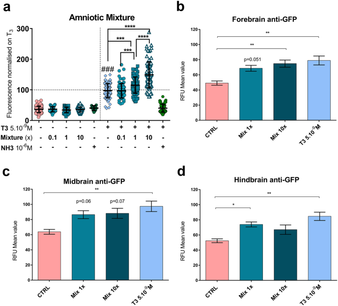 Figure 2. Thyroid disrupting activity of mixture assessed with XETA.Screening of thyroid disrupting activity of mixture of 15 molecules at concentrations measured in human amniotic fluid (mix 1x) 10 times more concentrated (mix 10x) and 10 times less concentrated (mix 0.1x) using Tg(thibz:eGFP) tadpoles. (a) GFP fluorescence (mainly localised in heads) of whole tadpoles exposed to mixture at 0.1x, 1x, 10x or a TR antagonist NH-3 (1âμM) with (right) or without (left) a T3 spike at 5 à 10â9 M. Quantification was done on images taken at 72âh exposure. Scattered dot plots are shown with mean +/â SD of five independent pooled experiments (normalised against T3). Statistics used non-parametric Kruskal-Wallis test (*pâ<â0.05, **pâ<â0.01, ***pâ<â0.001, ****pâ<â0.0001). Hashes (###) represent pâ<â0.001, T3 vs Control using column-to-column comparison. (bâd) Histograms represent mean (+/SEM) of relative fluorescence units (RFU) of GFP in forebrain (b), midbrain (c) and hindbrain (d) of tadpoles exposed to mixture for 72âh in the absence of T3. Regions were delimited manually on ventralbrain images (see Fig. S2c). Statistics used non parametric Kruskal Wallis compared to CTRL.