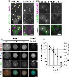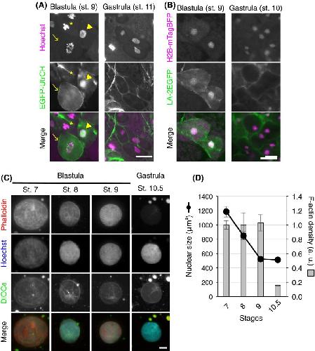 Figure 1.F-actin accumulates in the nucleus during the blastula stage. (A and B) Xenopus embryos were injected with EGFP-UtrCH (A) or LA-2EGFP and H2B-mTagBFP (B) mRNA and mounted on glass slides with Hoechst 33342 (A) or buffer (B) at the indicated stages before being gently squashed by a coverslip, followed immediately by observation by wide-field fluorescence microscopy. A nucleus accumulating EGFP-UtrCH, a mitotic blastomere and a blastomere at telophase is marked with arrowheads, arrows and asterisks, respectively. (A). Scale bar, 50 μm. (C) Nuclei were isolated from embryos at the indicated stages as described in Experimental Procedures. After fixation and staining of DNA, the nuclear envelope, and F-actin with Hoechst 33342, DiOC6, and DY-590-phalloidin, respectively, nuclei were observed by wide-field fluorescent microscopy. Representative images of each stage are shown. Scale bar, 10 μm. (D) Changes in nuclear size and F-actin density of embryo nuclei. Means for nuclear size and F-actin density were obtained by measuring the nuclear area stained with DiOC6 and the intensity of nuclear DY-590-phalloidin signal, respectively, on the nuclear images taken as described in (C) with original threshold using NIS-element BR software (Nikon). Error bars represent SE (n > 20). |