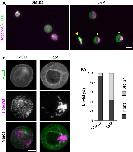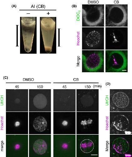 Figure 2. EGFP-UtrCH accumulates in nuclei formed in inhibitor-free egg extracts. (A) Centrifugal separation of the cytoplasm of Xenopus laevis eggs using cytochalasin B (CB)-containing (+) or CB-free (−) extraction buffer. Unfertilized Xenopus eggs were packed into a tube with buffer, and centrifugal separation was repeated twice as described in Experimental Procedures. In the absence of CB (−), a membranous layer containing pigment granules was formed beneath the lipid cap without clearly separating from the semitransparent cytoplasmic layer below. In the presence of CB (+), the semitransparent cytoplasmic layer was clearly separated from the lipid and membranous precipitates containing pigment granules. The cytoplasmic fractions between the lipid and precipitated membranes, which are indicated by bars, were removed and homogenized by pipetting for use as inhibitor-free (IFE) (−) and inhibitor-containing (ICE) (+) extracts. (B and C) AI-free (DMSO) and AI-containing (CB: cytochalasin B, 10 μg/mL) extracts were supplemented with permeabilized sperm (B) or those along with EGFP-UtrCH protein (C) and were activated by the addition of CaCl2. Nuclei at 3 h (B) or indicated time points (C) after incubation were observed by wide-field fluorescence microscopy with DNA (B, C) and the nuclear envelope (B) stained with Hoechst 33342 and DiOC6, respectively. The broken line in (C) indicates the nuclear contour. Scale bars, 20 μm. (D) Permeabilized sperm were added to IFE supplemented with EGFP-UtrCH protein and incubated for 120 min to induce nuclear formation. After Hoechst 33342 was added to the IFE, nuclei were observed without fixation by confocal microscopy as described in Experimental Procedures. Scale bar, 10 μm. |