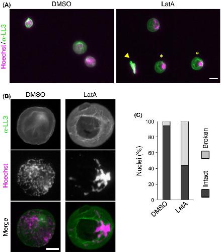 Figure 5. Nuclear F-actin stiffens the nuclear lamina in well-grown nuclei. (A) Permeabilized sperm were added to IFE supplemented with latrunculin A (LatA: 1.0 μm) or solvent (DMSO) and incubated for 120 min. After extracts were diluted with extraction buffer, nuclei were precipitated onto a coverslip by centrifugation, followed by fixation and staining with anti-LL3 antibody and Hoechst 33342 and observation by wide-field fluorescence microscopy. Asterisks and arrowhead indicate nuclei with ruptured lamina and a laminar fragment, respectively. Scale bar, 20 μm. (B) Representative images of each group are shown. Scale bar, 10 μm. (C) Ratio of nuclei broken through centrifugal precipitation. Numbers of intact and broken nuclei in the experiment described in (A) were counted. Nuclei with intact and ruptured nuclear lamina (see DMSO and LatA in B) were regarded as intact and broken nuclei, respectively. Bar graph shows the percentage of intact and broken nuclei formed in IFE supplemented with DMSO (n = 195) or LatA (n = 914) after centrifugal precipitation. |