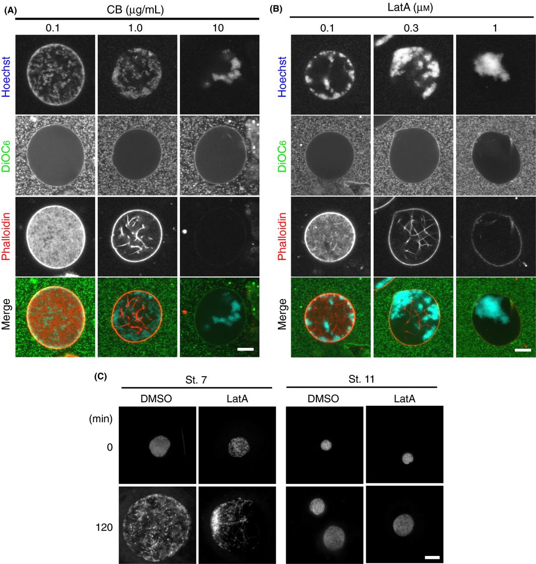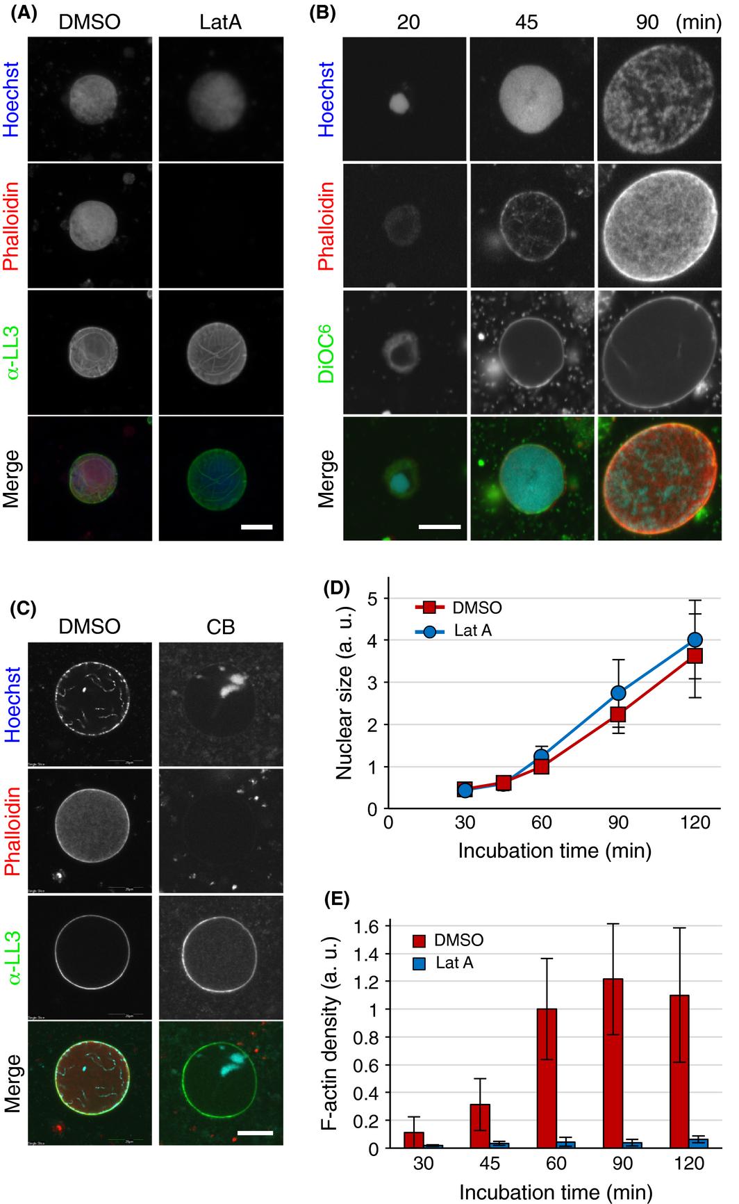 Figure 4. Nuclear F-actin maintains chromatin binding to the nuclear envelope in well-grown nuclei. (A and B) Permeabilized sperm were added to ICE supplemented with various concentrations of cytochalasin B (CB: 0.1, 1.0 or 10 μg/mL) (A) or latrunculin A (LatA: 0.1, 0.3, or 1 μm) (B) and incubated for 120 min. Nuclei were then fixed; stained with Hoechst 33342, DiOC6 and DY-590-phalloidin; and observed by confocal microscopy. Scale bars, 10 μm. (C) Nuclei isolated from embryos at stage 7 (blastula) and stage 11 (gastrula) were added to IFE supplemented with latrunculin A (LatA: 1 μm) or solvent (DMSO) and incubated for 120 min. Nuclei were then fixed, stained with Hoechst 33342, and observed by wide-field fluorescence microscopy. Scale bar, 10 μm. |