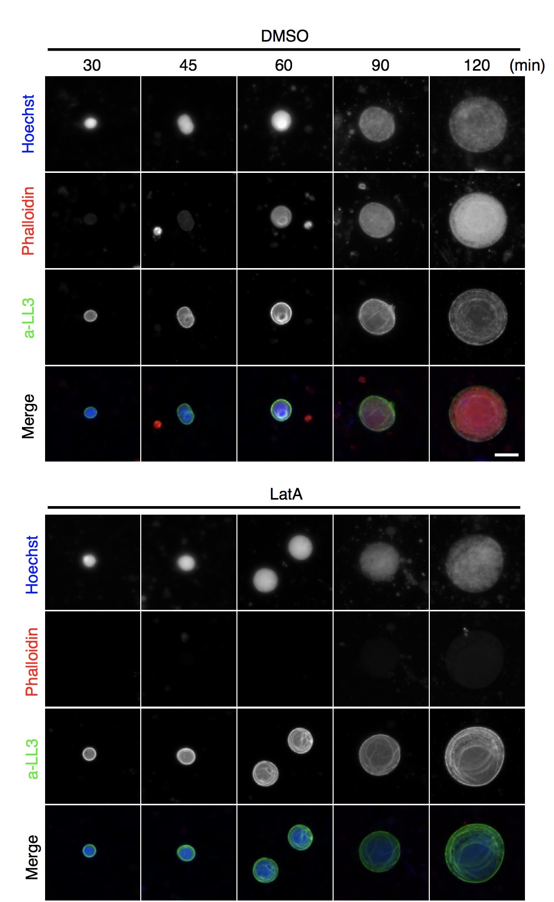 Figure S1 F-actin accumulates in nuclei formed in inhibitor-free egg extracts (related to Fig. 2). Permeabilized sperm were added to IFE supplemented with 1.0 µM latrunculin A (LatA) or solvent (DMSO), followed by activation of IFE. Nuclei at the indicated time points after activation were fixed, precipitated onto a coverslip by centrifugation, and stained with Hoechst 33342, anti-lamin L3 antibody, and DY-590-phalloidin for wide-field fluorescence microscopy. Scale bar, 20 µm. |