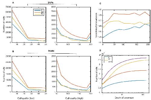 a function of bcftools call quality. Call quality corresponds to −10log10 probability that call is wrong). C. Ratio of transitions to transversions as a function of call quality (see A-B). D.