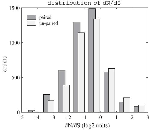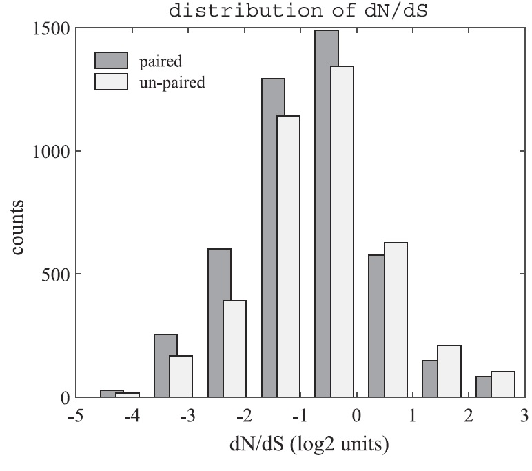 Fig. 3. A comparison between Dn/Ds distribution for paired and singleton genes,