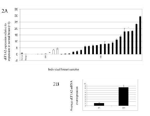 Figure 2. (A) Real-time RT-PCR analysis of RNA from breast tumours. Each block on the à axis represents a different tumour. The amount of eEF1A2 message is shown normalised to GAPDH and expressed relative to the level of expression in the normal breast RNA samples (=1). ER-negative tumours are shown in white, ER-positive tumours are shown in black. The difference in mean expression between ER-positive and ER-negative samples is 7.2 units (p = 0.0087), 95% Confidence Interval 2.0 to 12.4 units. (B) Average standardised RNA levels in ER-negative and ER-positive breast tumours. This difference is significant (P = 0.0087, t-test).