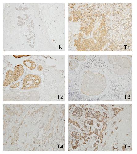 Figure 3. Immunohistochemistry of eEF1A2 in the breast. The panel labelled N shows the antibody staining weakly in a normal breast section. Panels T1 to T5 show breast tumours staining strongly with the anti-eEF1A2 antibody. Magnification ×10.