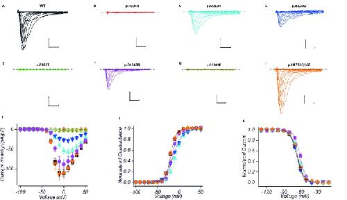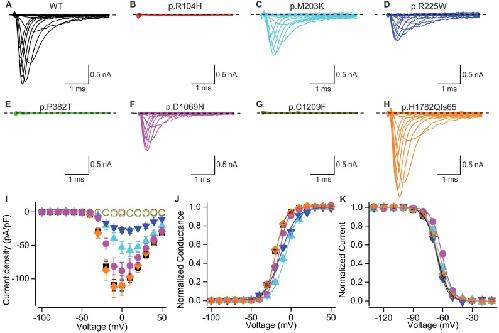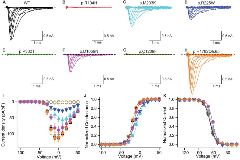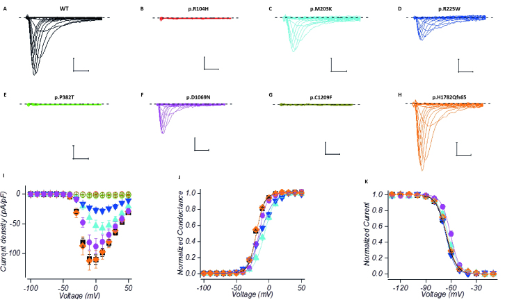 Figure 5. Electrophysiological characterization of congenital myopathy channel variants. Current traces in response to depolarizing test voltages for wild-type (WT; A), p.R104H (B), p.M203K (C), p.R225W (D), p.P382T (E), p.D1069N (F) p.C1209F (G) and p.H1782Qfs65 (H) channels expressed in HEK293 cells. Scale-bars are 1 ms (x-axis), 0.5 nA (y-axis). The dashed line represents the baseline current level at holding voltage. Mean current density (I) and normalized conductance (J) response to test voltages for channels expressed in HEK293 cells. Solid lines represent fit of Boltzmann equation to the mean data. Variants are colour coded as in A–H. Symbols: wild-type (square), p.M203K (triangle), p.R225W (inverted triangle), p.D1069N (circle), p.H1782Qfs65 (diamond). p.R104H, p.P382T and p.C1209F are all represented by open circles. Mean normalized currents in response to test voltage of −10 mV (HEK293) following a prepulse steps of 150 ms to voltages indicated in x-axis (K). Lines represent fit of Boltzmann equation to the mean data. Colour coding and symbols are as in I.