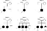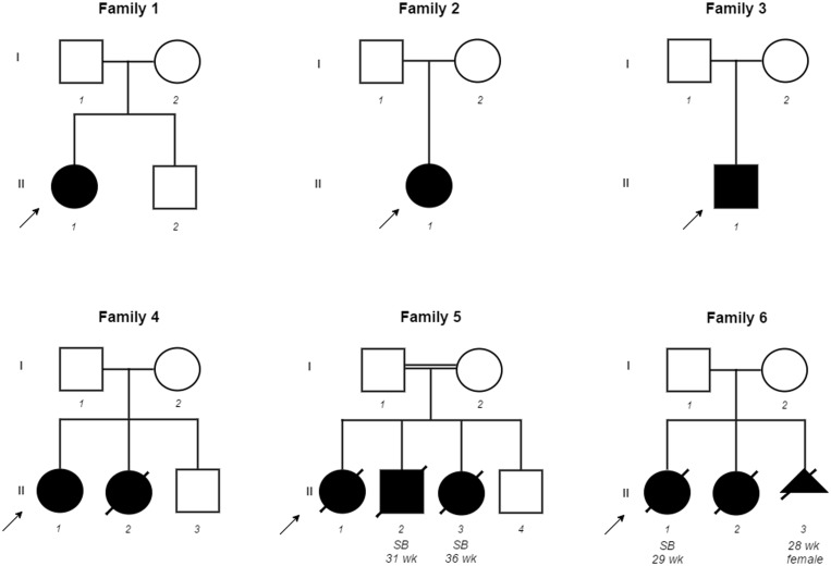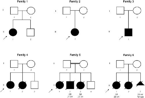 Figure 1. Pedigrees of all families with SCN4A mutations described in this study. Affected individuals are represented with shaded symbols, probands are indicated with an arrow, age at stillbirth (SB) or pregnancy termination are shown beneath symbols.