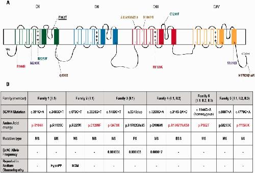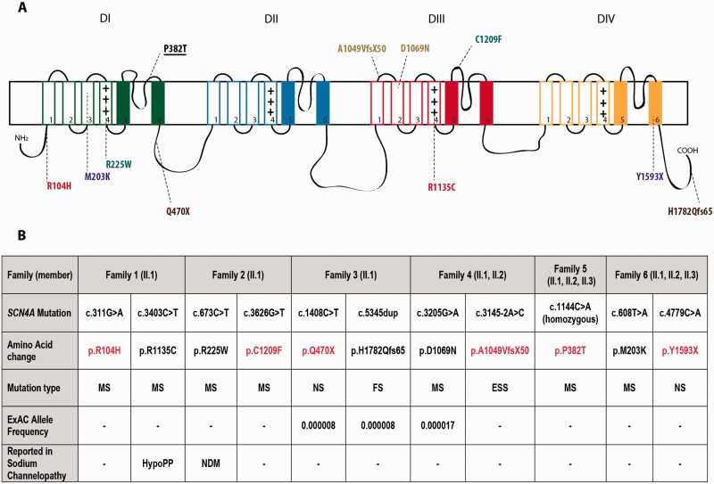 Figure 2. SCN4A mutations in congenital myopathy patients. Location of the mutations mapped onto a secondary structure of Nav1.4 channel (A). Compound heterozygous mutations identified in the affected individuals from one family are presented with the same colour. The homozygous mutation in Family 5 is shown underlined. Position, amino acid change, mutation type, frequency in ExAC database and association with sodium channelopathy of the reported mutations (B). Full loss-of-function mutations are presented in red. MS = missense mutation; NS = nonsense mutation; FS = frameshift mutation; ESS = essential splice site mutation; HypoPP = hypokalaemic periodic paralysis; NDM = non-dystrophic myotonia; - = not available.