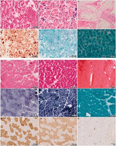 Figure 4. Muscle pathology in the foetal hypokinesia and ‘classical’ congenital myopathy affected individuals. Haematoxylin and eosin staining performed in the muscle samples taken from the foetal hypokinesia cases showed abnormal fibre size variation (A–C). Presence of fibrofatty tissue was noted in the muscle samples taken from affected foetuses II.2 from Family 4 and II.2 from Family 6 (A and B). Marked end-stage presence of fibrofatty tissue was seen in the post-mortem sections from Patient II.1 Family 6 (C). No mitochondrial abnormalities (D), rods or other inclusions were present in the muscle sample from affected foetus II.2 from Family 4 (D and E). Rods or other inclusions were also absent in Patient II.2 from Family 5 (F). Haematoxylin and eosin staining in the biopsies from ‘classical’ congenital myopathy cases showed myopathic features with abnormal fibre size variation without necrosis and regeneration (G–I). Mild fibrofatty replacement was present in the quadriceps biopsy taken from Patient II.1 Family 1 (age 2 years) (G), Patient II.1 Family 4 (age 1 month) (H) and Patient II.1 Family 3 (age 1.5 months) (I). NADH oxidative enzyme staining showed a population of small type 1 fibres with slow myosin in the biopsy of Patient II.1 Family 1 cohort member (J). This was confirmed with myosin heavy chain immunolabelling [fast myosin (M); slow myosin (N)]. Foetal myosin (O) showed scattered, abnormal, very small fibres measuring <5 µm. NADH histochemistry showed preserved fibre typing without cores or minicores in Patient II.1 Family 4 (K). Rods or other inclusions were absent in the Gomori Trichrome stain (Patient II.1 Family 3) (L).