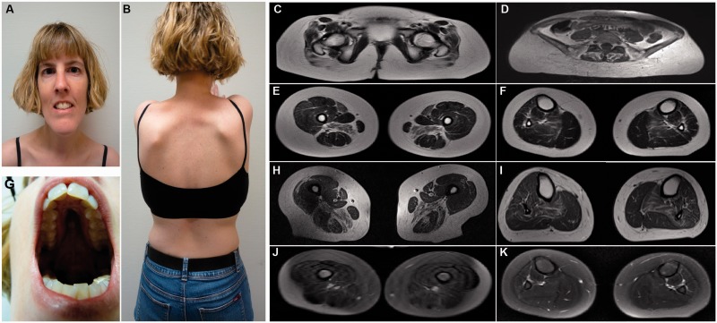 Figure 3. Clinical features in SCN4A congenital myopathy patients. Clinical images of the proband from Family 2 show mild facial weakness, elongated face (A), high arched palate (G) and bilateral scapular winging (B). T1-weighted muscle MRI images in the affected case from Family 1 (at age 6 years) (C, E and F) and in the proband from Family 2 (at age 35 years) (D, H and I) showed severe involvement of the gluteal muscles (C and D), bilateral, symmetric involvement of sartorius and adductor magnus in the upper leg (E and H) and involvement of soleus in the lower leg (F and I). T2-weighed muscle MRI images in the affected case from Family 1 demonstrated no oedema (J and K).