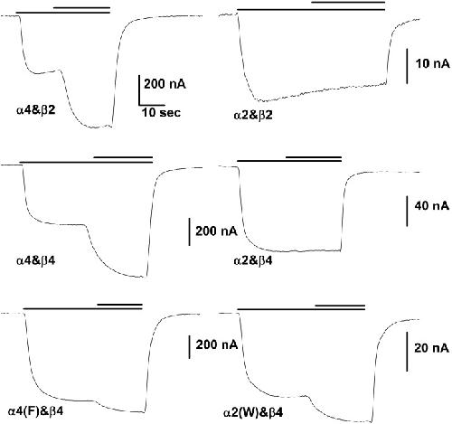 Fig 1. Representative responses of oocytes injected with the indicated subunits.In each case the lower bar above the traces indicates the time of application of ACh while the upper bar shows the time of application of the same concentration of ACh plus 10 μM βEST. The concentration of ACh was chosen to produce a response of about 10% of maximal. The horizontal scale bar in the upper left panel shows 10 sec for all panels. For the trace obtained with α4&β2 the ACh concentration was 3 μM, for α4&β4 3 μM, for α4(F)&β4 3 μM, for α2&β2 10 μM, for α2&β4 20 μM and for α2(W)&β4 20 μM. For the figure the data were smoothed by averaging 10 points.