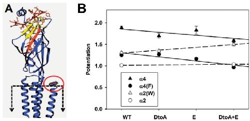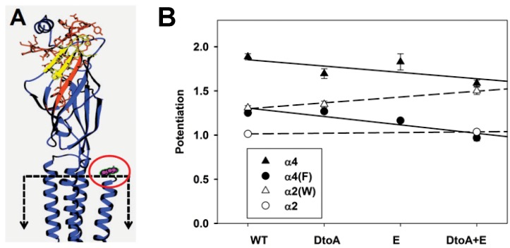 Fig 4. The effects of N-terminal chimeras on potentiation.Panel A shows a homology model of the α4 subunit (see Methods). A single subunit is shown, with the ion channel to the left and the extracellular solution at the top. The approximate location of the membrane is shown by the dashed box, note that the membrane spanning region is truncated in this view. The D to A loop region (MMT(57) to IVL(97)) is shown in red with amino acid side chains shown in stick representation, while the E loop (VTH(109) to QWT(124)) is shown in yellow. The carboxyl terminal region is shown in magenta and indicated by the red oval. In aligning the α4 subunit to sequence in the GluCl structure, the last amino acid in the structure aligned with the leucine in α4, so the AGMI residues are not shown. Note that the regions exchanged are far from the membrane and the C-terminal domain, but include portions of the ACh-binding site. Panel B shows potentiation for the different chimeras. The chimeric regions interchanged are indicated along the abscissa; chimeras were constructed on the α4 (filled triangles) and α4(F) (filled circles) subunits inserting sequence from the α2 subunit. Homologous transfers were made by transferring sequence from the α4 subunit into the α2 (hollow circles) and α2(W) (hollow triangles) subunits. The lines through the points for points show the lines predicted by linear regression on the source of the inserted region (see Methods). The slopes are -0.072 for chimeras on α4 and -0.095 on α4(F), and 0.008 for α2 and 0.066 for α2(W). None of the slopes differ significantly from 0 (P > 0.09). However, as shown in Table 5 in all cases the potentiation of receptors containing α4(DtoA+E) regions was significantly larger than those containing the homologous α subunits containing α2(DtoA+E) regions. Data values are given in Table 5.