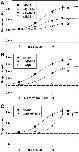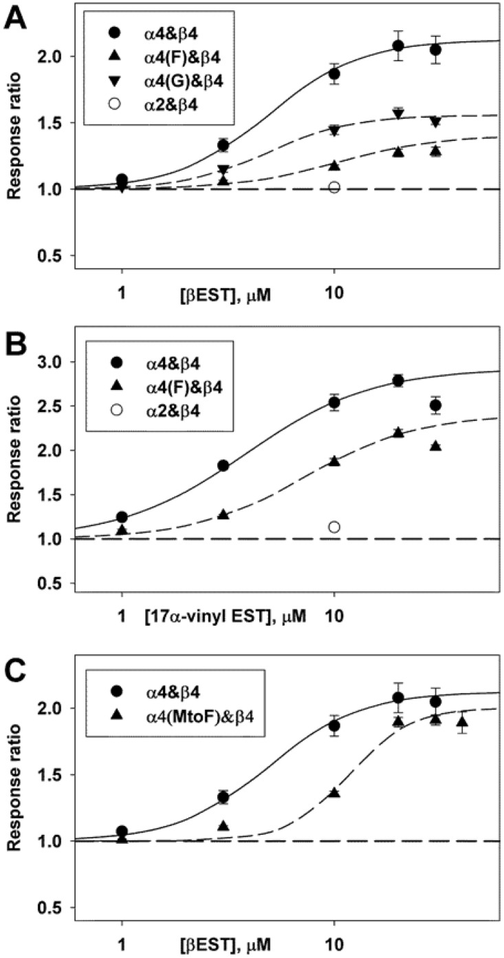 Fig 3. The effects of mutations on the concentration-effect relationship for potentiation.Data are shown for mutations of the tryptophan residue (WLAGMI; panels A and B) and the methionine residue (WLAGMI; panel C). ACh was applied at a concentration producing a response that produced a response of about 5 to 7% of maximal in the absence of steroid. The α subunit was expressed with β4 at an injection ratio of 20:1. The concentration-response relationship for potentiation was characterized by fitting a 3 parameter Hill equation to the ratios (Z[drug] = 1 + Zmax (1 / (1 + (EC50/[drug])^nHill), where Z is the response to a concentration of ACh in the presence of drug relative to that in the absence, Zmax is the maximal effect, EC50 is the concentration producing half-maximal potentiation, and nHill is the Hill coefficient. The fits did not include points that appeared to demonstrate block (e.g. data with 30 μM 17α-vinylestradiol). The data from each cell were fit separately, giving the following mean parameter estimates for βEST: α4: Zmax = 1.12 ± 0.12 (11 cells) and EC50 = 4.92 ± 0.48 μM; for α4(F): 0.41 ± 0.06 (3) P = 0.0002 and 10.43 ± 2.00 μM P = 0.4; for α4(G): 0.56 ± 0.03 (4) P = 0.001 and 4.90 ± 0.38 μM P = 0.98; and for α4(MtoF): 1.00 ± 0.03 (8) P = 0.34 and 11.76 ± 0.39 μM P < 0.0001, with values given as mean ± SE (number of cells) and significance of difference to α4 by t-test. The best-fitting estimates for 17α-vinylestradiol are: α4: 1.93 ± 0.06 (3) and 3.84 ± 0.27 μM and α4(F): 1.41 ± 0.08 (4) P = 0.004 and 7.32 ± 0.68 μM P = 0.010. The points show mean ± SE while the lines show the relationship predicted by the mean fit parameters.