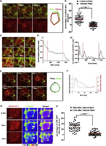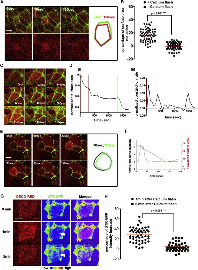 (F) Quantification of GECO-RED signal intensity over time (black line) with cell surface area over time (red line). Ca2+ flash precedes surface area reduction. Scale bars, 10 μm.