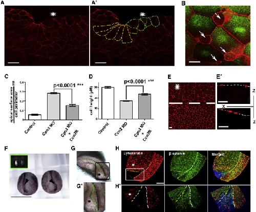 (A) Cross-section of a neurula-stage embryo injected at one dorsal blastomere at the four-cell stage with 40 ng CAPN2MO and stained with β-catenin. Injected side is indicated by an asterisk. β-catenin staining was used to trace the cortices of superficial cells (Aʹ). Scale bar, 20 μm.