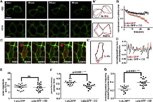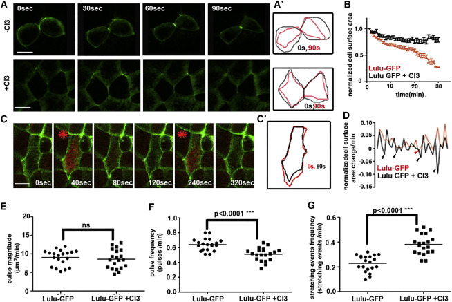 (A) Stills from time-lapse recordings show representative ectodermal cells from gastrula embryos expressing Lulu-GFP with and without CI3. Scale bar, 10 μm. (Aʹ) Cell cortices at 0 and 90 s are shown.
