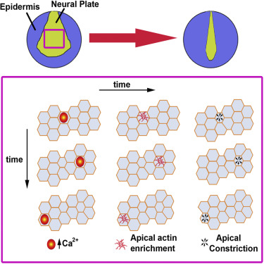 Neurulation is a critical period in all vertebrates and results in the formation of the neural tube, which gives rise to the CNS. Apical constriction is one of the fundamental morphogenetic movements that drives neural tube closure. Using live imaging, we show that apical constriction during the neurulation is a stepwise process driven by cell-autonomous and asynchronous contraction pulses followed by stabilization steps. Our data suggest that contraction events are triggered by cell-autonomous Ca(2+) flashes and are driven by a transient contractile apical pool of actin. In addition, we provide evidence that the cell autonomy and asynchrony of contraction are required for the correct spatial distribution of constriction and, as a result, are critical for tissue morphogenesis. Finally, we identify Calpain2 as a regulator of apical constriction and show that it is required for the stabilization step, but is dispensable during contraction.