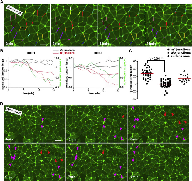 (A) Stills from a time-lapse sequence of a representative region within the neural plate of an embryo expressing utr-GFP. Several junctions (color coded) oriented parallel to the M/L axis of the neural plate shrink over time.