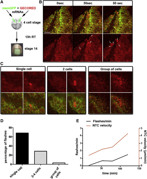 (B) Stills from a time-lapse recording (Movie S5) of anterior NTC from an embryo expressing mem-GFP (green) and GECO-RED (red). Arrows show Ca2+ flashes at different time points. Scale bar, 50 μm.