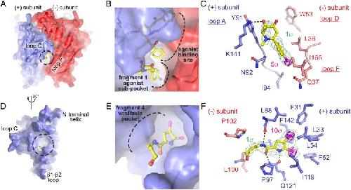 Fig. 4. Allosteric binding at the agonist subpocket and vestibule pocket in α7-AChBP. (A) α7-AChBP is shown in transparent surface and cartoon representation. The black dashed circle indicates the location of the agonist subpocket, which is occupied by fragment 1 right below the orthosteric binding site. (B) Detailed view of the overlapping agonist binding site and agonist subpocket. Lobeline and fragment 1 are shown in ball and stick presentation. (C) Detailed view of the amino acid interactions between fragment 1 and residues of the agonist subpocket. The green mesh is 2Fo − Fc density contoured at 1σ and the magenta mesh is anomalous difference density contoured at 5σ. (D) The location of the vestibule pocket is indicated with the black dashed circle. (E) Detailed view of the vestibule pocket, which is occupied by fragment 4. (F) Detailed view of the amino acid interactions between fragment 4 and residues of the vestibule pocket. The green mesh is 2Fo − Fc density contoured at 1σ and the magenta mesh is anomalous difference density contoured at 10σ.