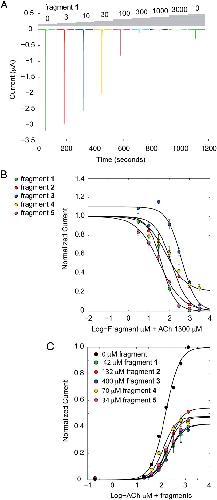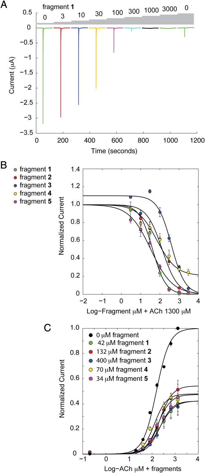 Fig. 6. Functional characterization of allosteric binders on the human α7 nAChR. (A) Example traces of the α7 nAChR repetitively activated with a fixed concentration of acetylcholine (1.3 mM). Coapplication of increasing concentrations of fragment 1 causes a progressive decrease in the ACh-activated current. (B) Concentration-inhibition curves constructed from data shown in A. Error bars indicate SD. (C) Effect of each fragment on the concentration-activation curve of acetylcholine. All of the fragments cause a decrease of the maximal current, without any pronounced effect on the EC50 value, which is indicative for an allosteric effect and is consistent with the crystal structures.