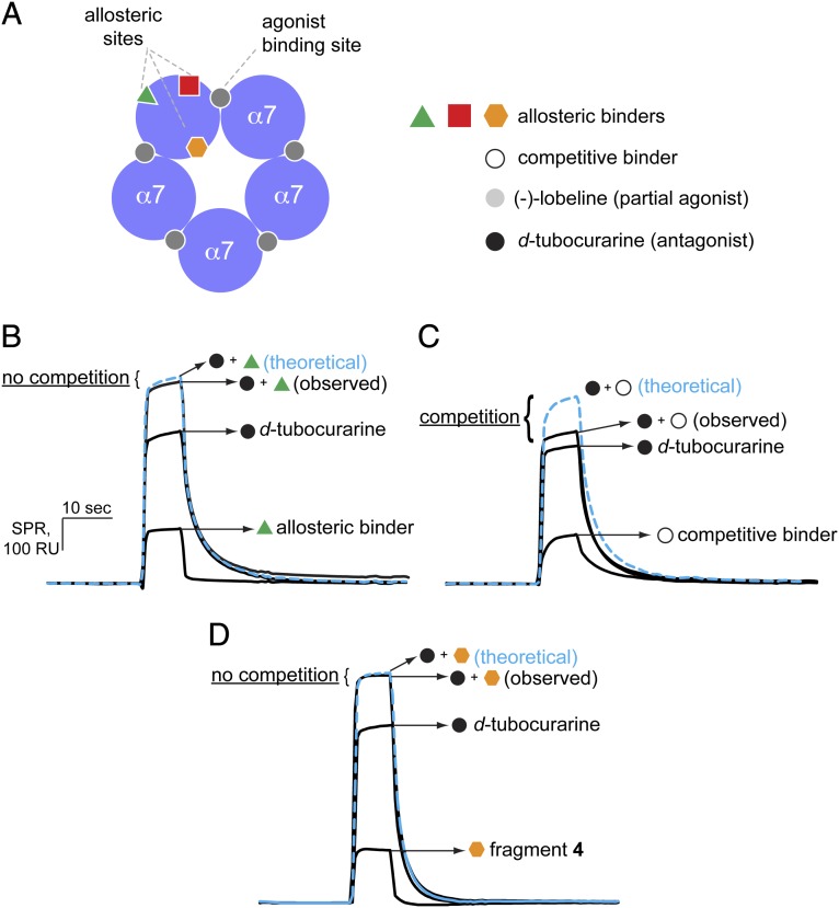 Fig. 2. Design of fragment-based screen for allosteric binders on α7-AChBP. (A) Schematic presentation of the location of the agonist binding site in α7-AChBP as well as possible allosteric binding sites. Competitive binders, the agonist lobeline, and the antagonist d-tubocurarine all compete for binding at the agonist binding site, whereas allosteric binders bind at different sites. (B) To distinguish allosteric binders from competitive binders using SPR spectroscopy we perfused each fragment alone (green triangle) or in combination with the competitive antagonist d-tubocurarine (black circle). In the case of an allosteric binder, the response units observed for the mixture of fragment + d-tubocurarine is close to the sum of fragment alone + d-tubocurarine alone (blue dashed line). No competition exists because the fragment and d-tubocurarine bind at distinct sites. (C) In the case of a competitive binder, the response units for the mixture of fragment + d-tubocurarine is lower than the sum of fragment alone + d-tubocurarine alone because both compounds compete for binding at the same site. (D) Example traces for fragment 4, which was identified as one of the allosteric binders in this study.