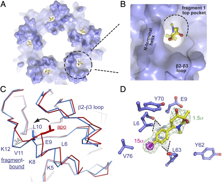 Fig. 3. Allosteric binding at the top pocket in α7-AChBP. (A) Fragment 1 reveals an allosteric binding site located at the N-terminal α-helix of α7-AChBP and is termed the top pocket. α7-AChBP is shown in transparent surface and cartoon representation. Fragment 1 is shown as yellow ball and sticks. (B) Detailed view of fragment 1, wedging between the N-terminal helix and the β2–β3 loop. (C) Binding of fragment 1 causes a conformational change of the N-terminal helix, which is noticeable as a 3-Å displacement of residue K12 and a change in the rotamer of L10. The blue ribbon represents the fragment-bound conformation, and the red ribbon represent the apo state. (D) Detailed view of the amino acid interactions between fragment 1 and residues of the top pocket. Fragment 1 is shown in ball and sticks. Yellow is carbon, red oxygen, blue nitrogen, bromine magenta. The green mesh is 2Fo − Fc density contoured at 1.5σ and the magenta mesh is anomalous difference density contoured at 15σ. The black dashed triangles indicate Van der Waals interactions.