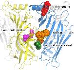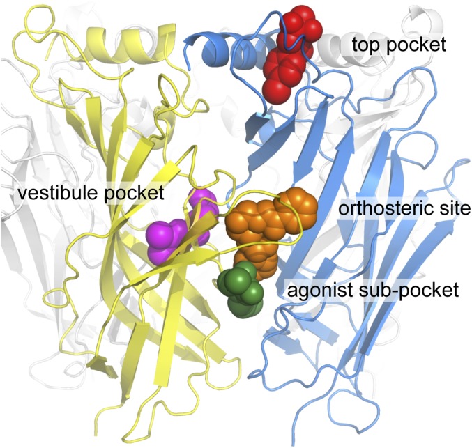 Fig. 5. Overview of the different allosteric binding sites discovered in α7-AChBP. α7-AChBP is shown in cartoon representation. Lobeline and different allosteric binders are presented as spheres. The orange ligand corresponds to lobeline and occupies the orthosteric binding site. The red ligand occupies the top pocket, the green ligand occupies the agonist subpocket, and the magenta ligand occupies the vestibule pocket.