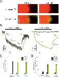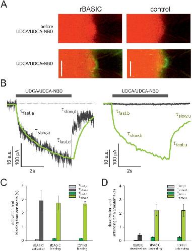 Figure 3. Correlation of UDCA membrane binding and rBASIC activation.A) Confocal images of patch pipettes containing outside-out patches excised from Xenopus laevis oocytes. Left panel, membrane patch excised from an oocyte expressing rBASIC, before (upper panel) and after (lower panel) application of UDCA-NBD/UDCA (50 µM/1.6 mM). Right panel, membrane patch excised from an uninjected control oocyte, before (upper panel) and after (lower panel) application of UDCA-NBD/UDCA. Green fluorescence signals originated from UDCA-NBD binding to the membrane, red fluorescence signal originated from DY647 background dye (1 µM) staining the bath solution. The transmission channel is overlayed. Scale bar = 5 µm. B) Binding time courses and current time courses after sudden UDCA-NBD/UDCA concentration jumps, obtained from a membrane patch excised from an rBASIC expressing oocyte (left panel) and a membrane patch excised from an uninjected control oocyte (right panel). Green traces represent fluorescence signals induced by UDCA-NBD binding and unbinding to the patch membranes (for clarity, increase in fluorescence is depicted as downward deflection). Grey traces represent simultaneously recorded current traces. Averages of three consecutive measurements are shown. Time courses of activation/binding and deactivation/unbinding were fitted by the sum of two exponentials (equations (2a) and (2b)). τfast, τslow represent fast and slow time constants for rBASIC activation/inactivation and UDCA-NBD binding/unbinding events (a, rBASIC activation; b, UDCA-NBD binding; d, rBASIC deactivation; u, UDCA-NBD unbinding). C) and D) Quantitative comparison of slow and fast time constants of rBASIC activation and UDCA-NBD binding (C) and rBASIC deactivation and UDCA-NBD unbinding (D). Error bars represent SEM; n = 3–7. |
