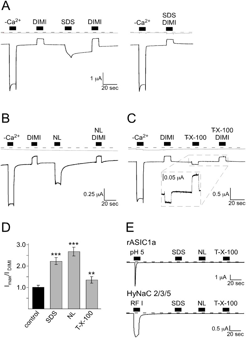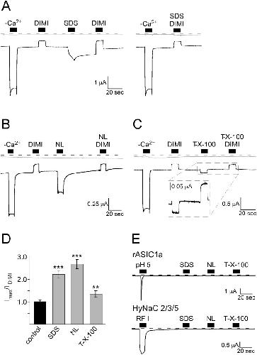 Figure 4. Other membrane-active substances, which are structurally unrelated to bile acids also activate BASIC.A–C) Representative current traces (black) of BASIC-expressing oocytes showing that the application of 400 µM SDS (A, left panel), 500 µM N-Lauroylsarcosine (NL) (B) and 100 µM Triton-X 100 (C) increased the activity of BASIC. The application of 100 µM diminazene (DIMI) alone or together with SDS (A, right panel), NL (B) or Triton-X 100 (C) inhibited BASIC currents. Non-injected oocytes did not respond to the application of the substances (grey traces). Dotted lines represent the 0 current level. (D) Quantitative comparison of current amplitudes induced by SDS, NL or Triton-X 100. Currents were normalized to the DIMI-sensitive current in the absence of stimulatory substances, which had an amplitude of 0.25±0.03 µA (n = 8). Error bars represent SEM. Statistical significances were tested using one-way ANOVA followed by Tukey's multiple comparison test versus control, **p<0.01, ***p<0.001, n = 8. (E) Representative current traces of oocytes expressing ASIC1a or HyNaC2/3/5. Application of pH 5 or 5 µM RFamide I, respectively, activated the channels, while application of 400 µM SDS, 500 µM NL or 100 µM Triton-X 100 did not. |