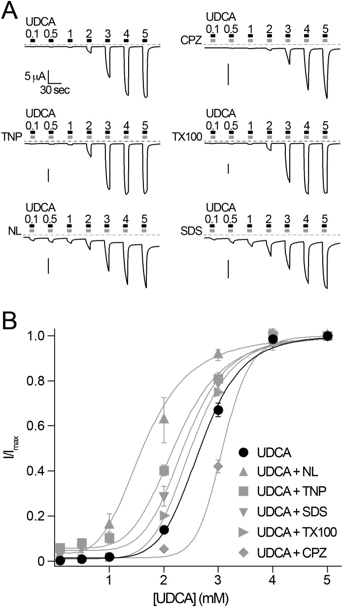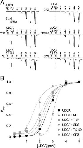Figure 5. Bile acids and other membrane-active substances activate BASIC by a similar mechanism.A) Representative current traces of BASIC showing the concentration-dependent activation of BASIC by UDCA in the absence and presence of membrane active substances (CPZ, 500 µM; TNP, 2 mM; TX100, 100 µM; NL, 500 µM or SDS, 400 µM). Dotted lines represent the 0 current level B) Concentration-response curves for UDCA in the presence and absence of membrane active substances. Currents were normalized to the maximum current at 5 mM UDCA, which was 23.8±2.4 µA. Error bars = S.E.M., n = 10. Curves represent fits to the Hill equation (equation (1)). |