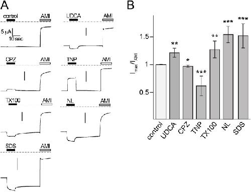 Figure 7. Mouse BASIC is also affected by membrane active substances.A) Representative current traces of mBASIC-expressing oocytes showing that the application of 2 mM UDCA, 500 µM CPZ, 10 mM TNP, 100 µM Triton-X 100, 500 µM NL or 400 µM SDS change the activity of mBASIC. Dotted lines represent the 0 current level. To evaluate the amiloride-sensitive current 100 µM amiloride (AMI) was applied after wash-out of the membrane active substances. (B) Quantitative comparison of current amplitudes induced by UDCA, CPZ, TNP, Triton-X 100, NL or SDS. Currents were normalized to the amiloride-sensitive current, which had an amplitude of 12.3±2.4 µA (n = 56). Error bars represent SEM. Statistical significances were tested using one-way ANOVA followed by Tukey's multiple comparison test versus control, *p<0.05, **p<0.01, ***p<0.001, n = 8. |