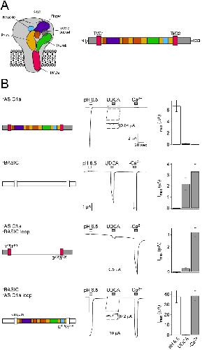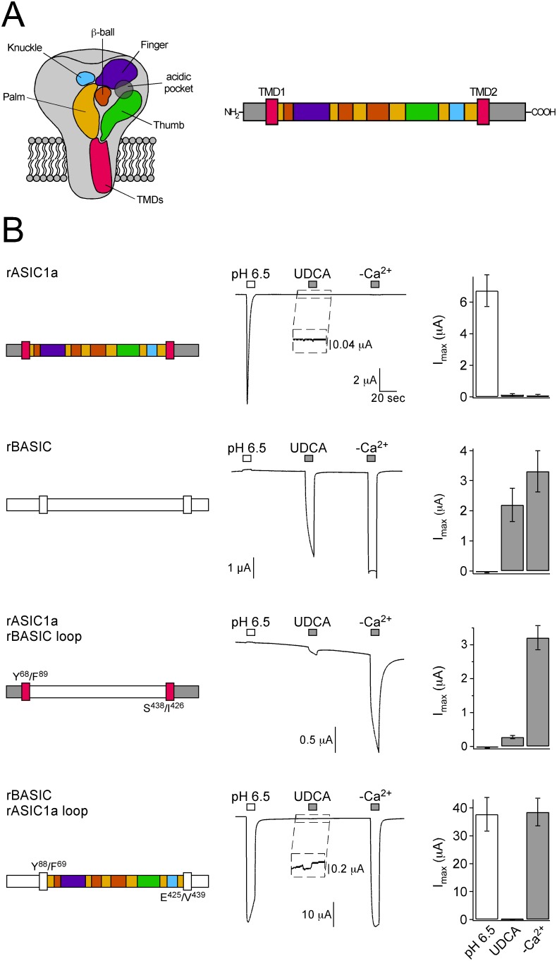 Figure 8. The ECD of rBASIC is involved in bile acid sensitivity.A) Left, scheme of ASIC1 showing the domain organization of one subunit as suggested by Jasti et al. based on the crystal structure of chicken ASIC1 [3]. The ECD consists of five domains: palm (yellow), thumb (green), finger (violet), knuckle (blue) and β-ball (orange). Right, linear scheme of ASIC1a showing the domains in the same color coding as in the scheme on the left. Presumably, BASIC shows a similar domain organization as ASIC1a. B) Left panel, schematic drawings of rASIC1a, rBASIC and chimeras; rASIC1a is depicted as in A), for clear distinction, rBASIC is depicted in white. Residues defining the borders of the rASIC1a and rBASIC sequences are shown. Middle panel, representative traces of currents induced by the subsequent application of pH 6.5 and 2 mM UDCA followed by the removal of divalent cations (–Ca2+). Right panel, quantitative comparison of current amplitudes induced by pH 6.5, UDCA and divalent cation removal. Error bars represent SEM; n = 6–12. Note that different amounts of cRNA were injected (rASIC1a, 0.8 ng; rBASIC, rASIC1a-rBASIC-loop and rBASIC-rASIC1a-loop, 8 ng, respectively). |
