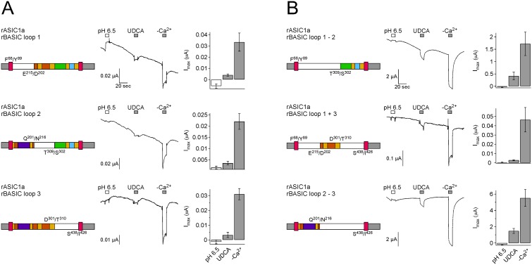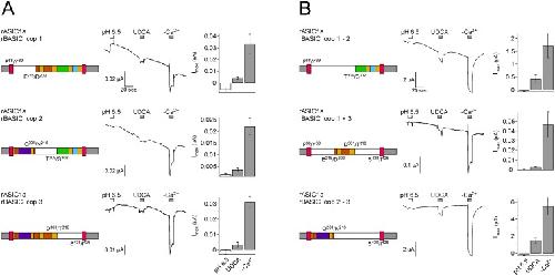 Figure 9. Several regions of the ECD of rBASIC are involved in bile acid sensitivity.A, B) Left panel, schematic drawings of chimeras; rASIC1a portions are depicted as in Fig. 5A, rBASIC portions are depicted in white. Residues defining the borders of the ASIC1a and BASIC sequences are shown. Middle panel, representative traces of currents induced by the subsequent application of pH 6.5 and 2 mM UDCA followed by the removal of divalent cations (–Ca2+). Right panel, quantitative comparison of current amplitudes induced by pH 6.5, UDCA and divalents removal. Error bars represent SEM; n = 6–12. |