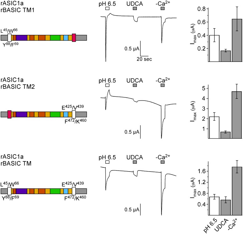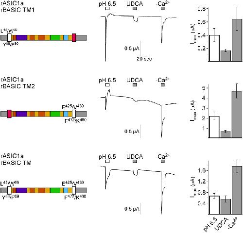 Figure 10. The TMDs of rBASIC are involved in bile acid sensitivity.Left panel, schematic drawings of chimeras; rASIC1a portions are depicted as in Fig. 5A, rBASIC portions are depicted in white. Residues defining the borders of the ASIC1a and BASIC sequences are shown. Middle panel, representative traces of currents induced by the subsequent application of pH 6.5, 2 mM UDCA, and removal of divalent cations (–Ca2+). Right panel, quantitative comparison of current amplitudes induced by pH 6.5, UDCA and divalent cation removal. Error bars represent SEM; n = 6–12. |