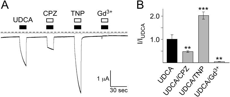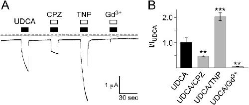 Figure 1. BASIC responses to bile acid are modulated by the membrane active substances chlorpromazine, trinitrophenol and Gd3+.A) Representative current traces of an oocyte expressing BASIC (black trace) and a water-injected control oocyte (grey trace). Application of 2 mM UDCA induced a typical BASIC current. Co-application of 0.5 mM CPZ strongly decreased the UDCA-dependent current while co-application of 2 mM TNP strongly increased the current amplitude. The UDCA-dependent current was completely abolished by 100 µM Gd3+. Dotted line represents the 0 current level. B) Quantitative comparison of current amplitudes induced by UDCA alone or together with 0.5 mM CPZ, 2 mM TNP or 100 µM Gd3+. Currents were normalized to the current induced by UDCA alone, which had an amplitude of 1.1±0.2 µA (nâ=â10). Error bars represent SEM. Statistical significances were tested using one-way ANOVA followed by Tukey's multiple comparison test versus UDCA, **p<0.01, ***p<0.001. |