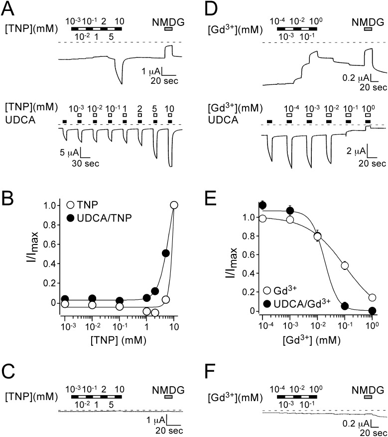 Figure 2. TNP increases while Gd3+ decreases BASIC activity in a dose-dependent manner.A) Representative current traces showing the concentration-dependent activation of BASIC by TNP. Upper panel, increasing concentrations of TNP were applied to a rBASIC expressing oocyte. Lower panel, increasing concentrations of TNP were co-applied with 2 mM UDCA. Dotted lines represent the 0 current level. B) Concentration-response curves for TNP in the absence (open circles) and presence (closed circles) of 2 mM UDCA. Currents were normalized to the maximum currents in the presence of TNP, which had amplitudes of 3.9±0.4 µA and 12.1±2.5 µA (n = 10) in the absence and presence of 2 mM UDCA, respectively. The current amplitude of 2 mM UDCA alone was 4.1±0.4 µA (n = 10). Error bars represent SEM, curves were fitted to the Hill equation. C) Representative current trace of a non-injected oocyte treated with increasing concentrations of TNP. D) Representative current traces showing the concentration-dependent inhibition of BASIC by Gd3+. Upper panel, increasing concentrations of Gd3+ were applied to a rBASIC expressing oocyte. Lower panel, increasing concentrations of Gd3+ were co-applied with 2 mM UDCA. Dotted lines represent the 0 current level. E) Concentration-response curves for Gd3+ in the absence (closed circles) and presence (open circles) of 2 mM UDCA. Currents were normalized to the maximum currents in the absence of Gd3+, which had amplitudes of 1.2±0.2 µA and 3.2±0.6 µA (n = 10) in the absence and presence of 2 mM UDCA, respectively. Error bars represent SEM, curves were fitted to the Hill equation. F) Representative current trace of a non-injected oocyte treated with increasing concentrations of Gd3+. |