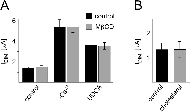 Figure 6. Cholesterol does not affect rBASIC activity.A) Removal of cholesterol does not influence rBASIC activity. Quantitative comparison of DIMI-sensitive rBASIC currents from oocytes that were incubated in low Na+ OR-2 medium containing 20 mM MβCD (grey bars) or 20 mM mannitol (control, black bars) for approximately 2 h prior to recordings. Current amplitudes in the absence of any stimulus (control), in the absence of extracellular Ca2+ (−Ca2+) and in the presence of 2 mM UDCA are shown. B) Addition of cholesterol does not influence rBASIC activity. Quantitative comparison of DIMI-sensitive rBASIC current amplitudes before (black bar) and after 10 sec application of 2 mM MβCD-balanced water-soluble cholesterol (grey bar). Error bars represent SEM, n = 8. |