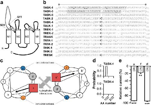 Figure 1. A coiled-coil prediction in the M1-P1 linker of TASK-1 channels.(a) Transmembrane topology of TASK-1. The extracellular region corresponding to the cap structure of other K2P channels is indicated. (b) Amino acid sequence alignment of different K2P channels for the extracellular region indicated in (a). The cysteine residues, conserved in most K2P channels, are highlighted in bold. Residues of the four heptad repeat coiled-coil predictions in TASK-1 and TASK-3 are indicated in italics and by underlining. (c) Coiled-coil structures usually contain a repeated pattern of hydrophobic (h) and charged (c) amino-acid residues. ‘hxxhcxc’ refers to a heptad repeat re-occuring after every two turns of the helix. The positions within the heptad repeat are commonly labeled as ‘a–g’, where ‘a’ (red) and ‘d’ (gray) are the hydrophobic core positions, often occupied by the amino acids isoleucine, leucine, or valine, thus stabilizing helix dimerization through hydrophobic and van-der-Waals interactions, whereas ‘e’ (orange) and ‘g’ (blue) are typically solvent-exposed, polar residues (e.g. glutamate or lysine) that give specificity between the two helices through interhelical electrostatic interactions. The remaining three positions (‘b’, ‘c’, and ‘f’, white) must be all hydrophilic, as these will form helical solvent exposed surfaces. (d) Coiled-coil prediction tools revealed with a high probability a four-fold coiled-coil repeat in TASK-1 (top), whereas for instance in TASK-4 no coiled-coil domain was predicted (bottom). AA, amino acid. (e) Typical interaction sites of coiled-coil domains were mutated and current amplitudes, analyzed at +40 mV, were compared to wild-type TASK-1. ‘a’, indicates the four-fold mutation of all a-sites (R38A/Q45A/Y52A/Y59A); ‘f’, indicates the four-fold mutation of all f-sites (L43A/A50V/G57A/R64A); ‘d’, indicates the four-fold mutation of all d-sites (L41A/L48A/S55A/L62A). **p < 0.01; ***p < 0.001. Unpaired Student’s T-Test. Data are presented as Mean ± SEM. The number of experiments are included in the bar graph.
