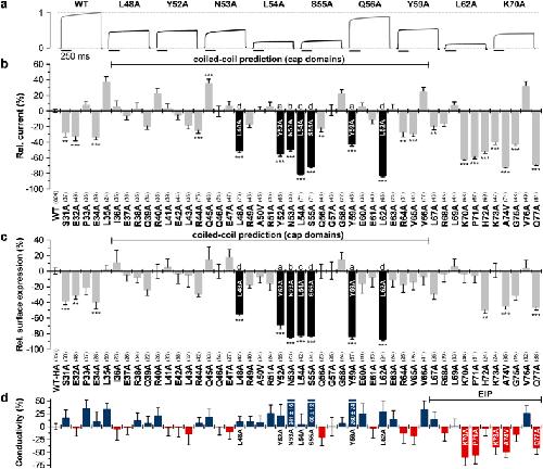 Figure 2. Alanine scan through the extracellular M1-P1 linker of human TASK-1 reveals hydrophobic residues relevant for functional surface expression.(a) Normalized representative current traces of wild-type and mutant TASK-1 channels recorded in Xenopus oocytes by a voltage step to +40 mV. (b) Relative current amplitudes at +40 mV compared to wild-type TASK-1 (WT). Mutants within the predicted coiled-coil domain exhibiting a pronounced current amplitude reduction are highlighted in black. (c) Relative surface expression analyzed with a chemiluminescence assay of wild-type TASK-1 with an extracellular HA epitope (WT-HA) and TASK-1 mutants introduced into the WT-HA background. Mutants within the predicted coiled-coil domain showing a strong reduction in relative surface expression are highlighted in black. (b,c) **p < 0.01; ***p < 0.001. Unpaired Student’s T-Test. Significance was probed against WT or WT-HA. Data are presented as Mean ± SEM. The number of experiments are indicated in parentheses above the construct name. (d) The ‘conductivity’ of TASK-1 mutants was calculated by dividing the relative change in current amplitudes of a mutant by the relative change in surface expression of the respective mutant. Red bars indicate a loss of channel gating, due to a reduced single-channel conductance or open probability (Po). Data are presented as Mean ± SEM.