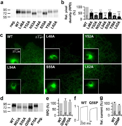 Figure 3. Protein expression of the identified TASK-1 ‘hits’.(a) Western blot analysis of Xenopus protein lysates after injection of HA-tagged TASK-1 wild-type (WT) or indicated TASK-1 mutants using anti-HA antibodies. Samples were not treated with a reducing agent as DTT, thus the proteins appear as a dimer. (b) Analysis of the pixel intensities of the protein signals corresponding to dimeric TASK-1 from 4 to 11 independent western blots normalized to TASK-1 wild-type without DTT. Image J was used for pixel intensity analysis. RPD: relative pixel density. (c) Live cell imaging of TASK-1 mutants in HeLa cells. HeLa cells were transfected with the indicated pEGFP-TASK-1 mutants and fluorescence imaging was performed 48 h after transfection. (d) Western blot analysis of protein lysates of oocytes 48 hours after injection of HA-tagged TASK-1 wild-type (WT) or indicated TASK-1 mutants using anti-HA antibodies. Samples were not treated with a reducing agent as DTT, thus proteins appear as a dimer. (e) Analysis of the pixel intensities of the protein signals corresponding to dimeric TASK-1 from 4 to 11 independent western blots normalized to TASK-1 wild-type without DTT. Image J was used for pixel intensity analysis. (f) Current traces of TASK-1 WT compared to the Q56P mutant, preventing glycosylation. (g) Current amplitudes at +40 mV for TASK-1 (WT) and the Q56P mutant normalized to TASK-1 were plotted. (b,e,g) ***p < 0.001. Unpaired Student’s T-Test. Significance was probed against wild-type TASK-1 (WT). Data are presented as Mean ± SEM. The number of experiments are included in the bar graphs.